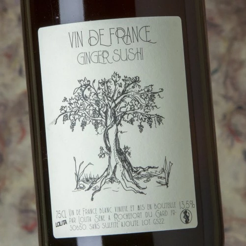 Lolita Ginger Sushi is a jewel of her production, the result of a 10-day maceration of skins with the whole grape harvest without destemming of the Grenache and Clairette varieties, with the addition of a few drops of Cinsault in a direct press. This is a magnificent orange wine, pure, fresh, intense, balanced and long, with no added sulphites, unclarified and unfiltered.